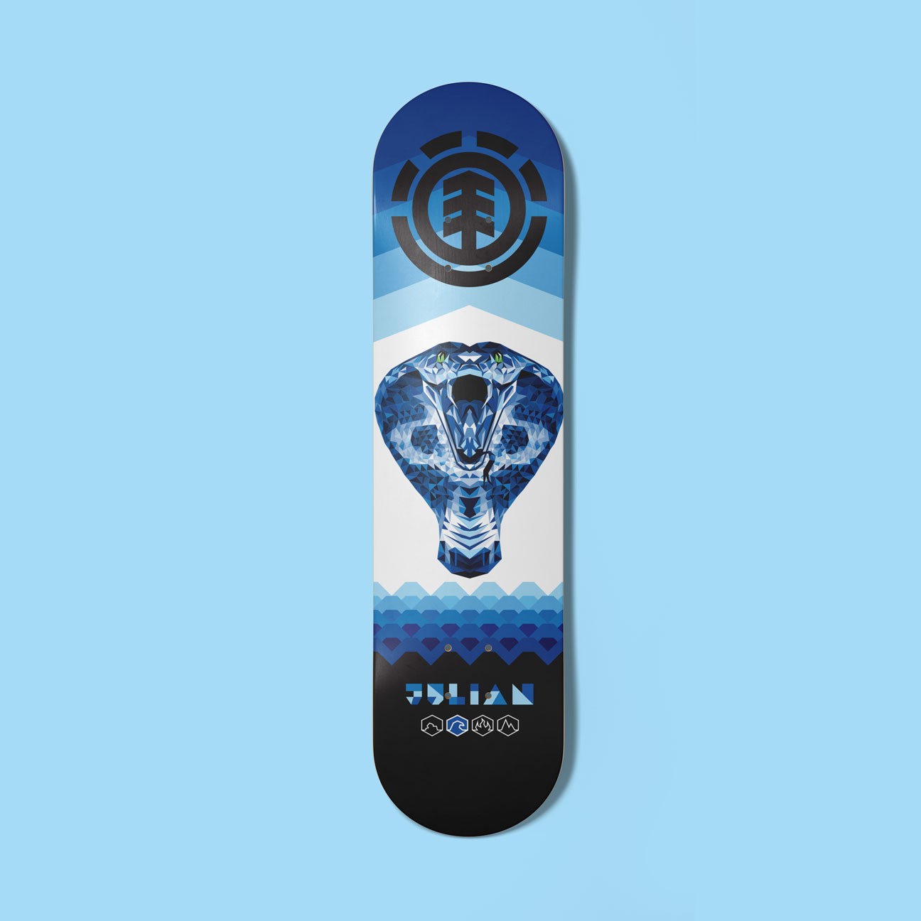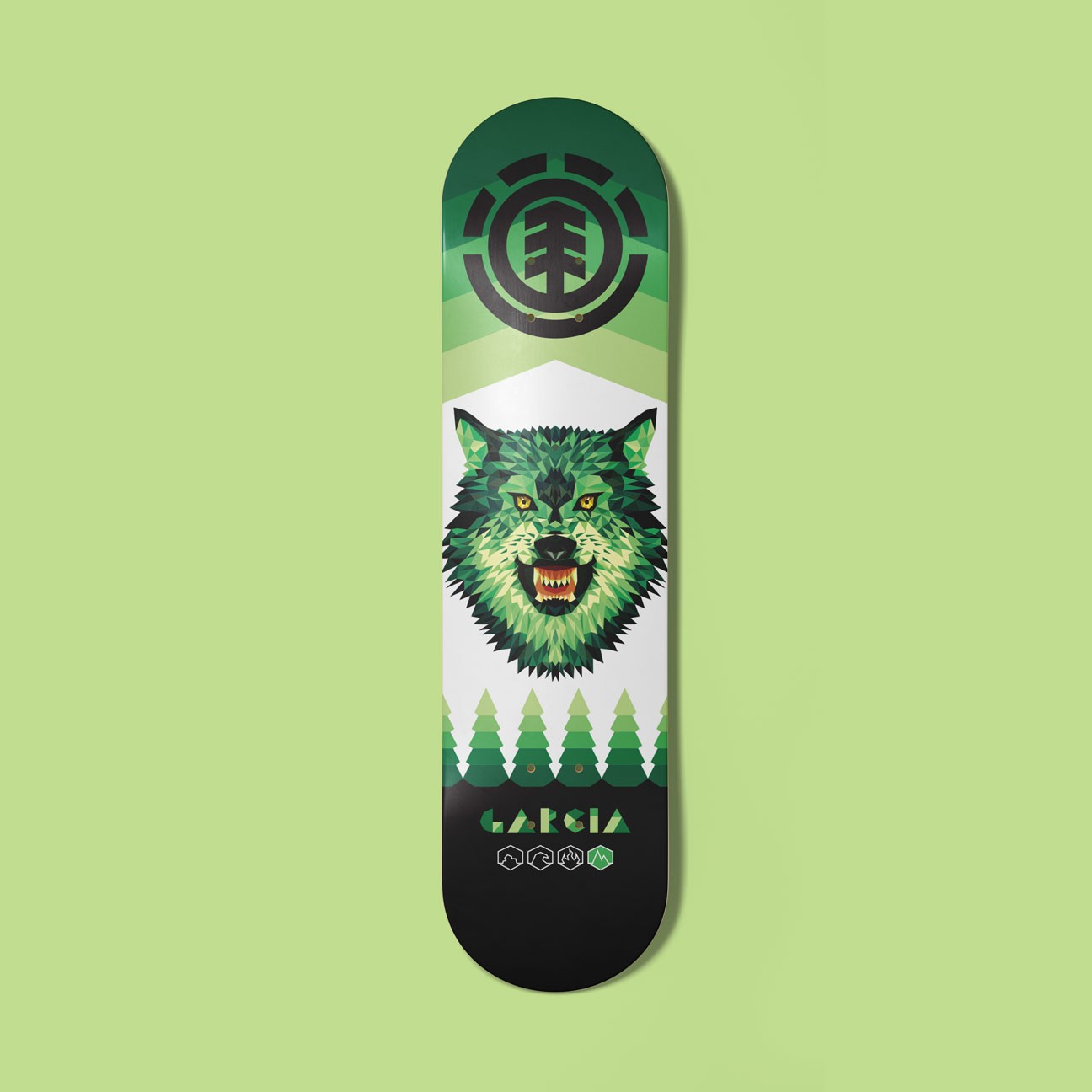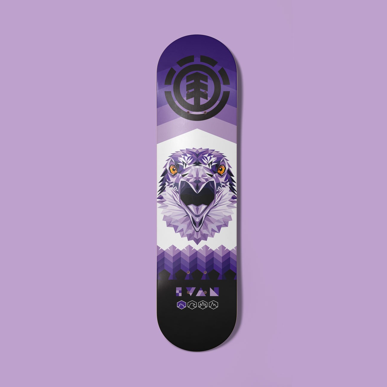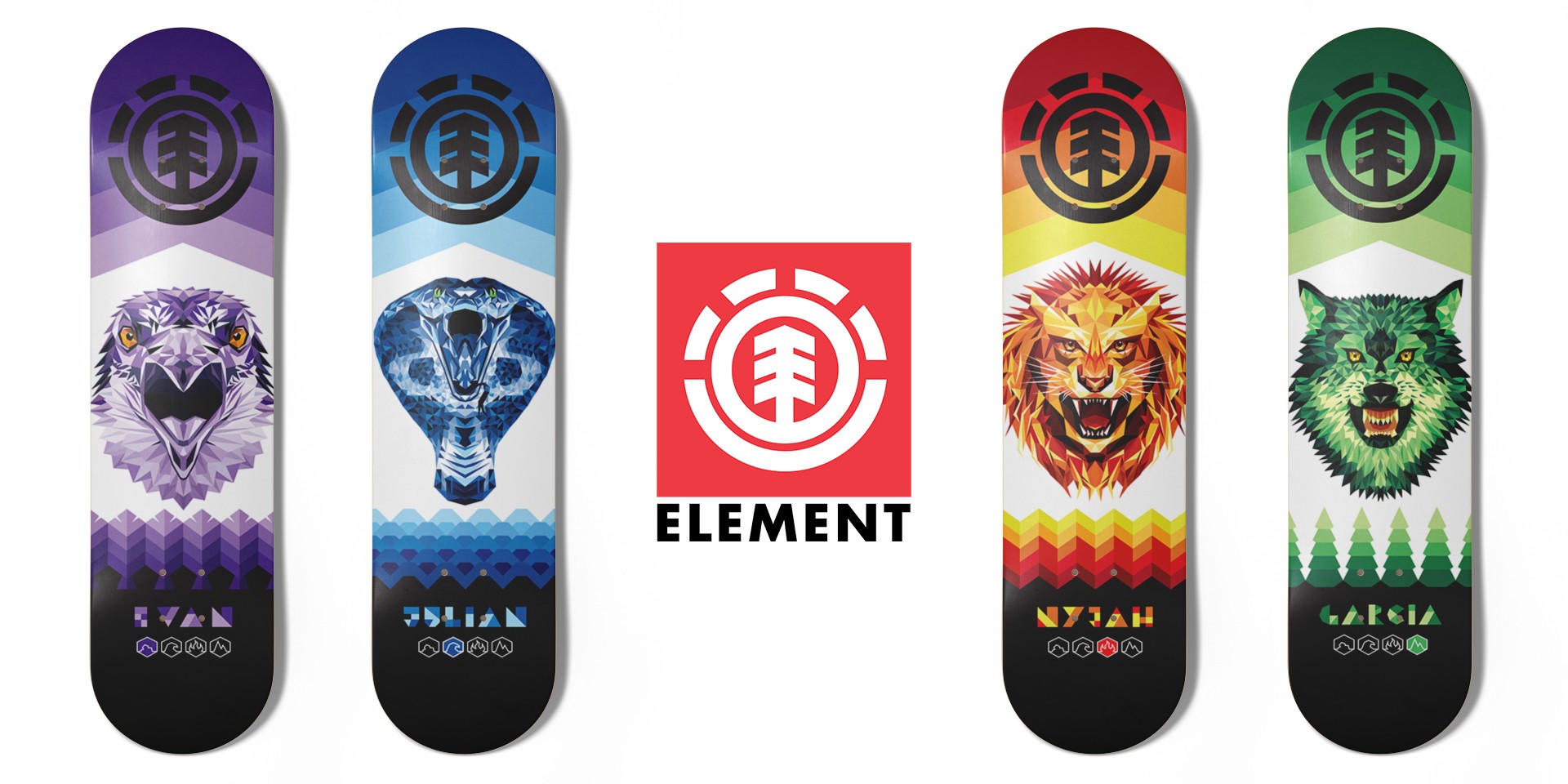 As a dedicated and driving force in skateboarding since 1992, Element has evolved to span the space between skateboarding, nature and culture for more than three decades. Element exists to shine a light on skateboarding and the power it has to connect people, passions and lifestyles. Element exists to connect you to endless possibilities, through skateboarding, nature and culture. In 2014 I was commisioned by the Creative Director of Element Skateboards to produce my own line of the brand's most iconic skateboard series "Wind Water Fire Earth". Given 4 different riders, I tied each of the four elements to an animal that represented their unique styles. Each illustration utilized a geometric art style utilizing simple shapes to create a much larger detailed image of each animal.